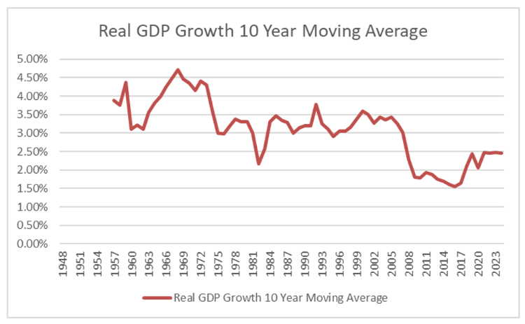 To better understand this, our team created a chart showing the annual growth of the U.S. economy using a 10-year rolling average, going all the way back to the 1950s. The rolling average helps smooth out short-term volatility and provides a clearer picture of long-term trends.